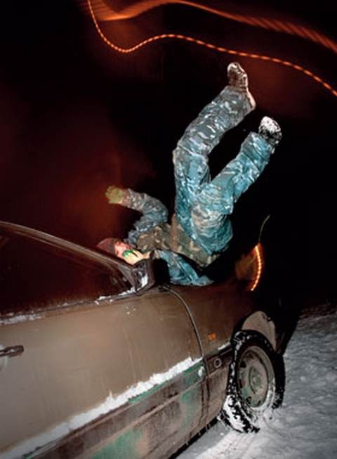 Дети по очереди с разбегу набрасываются на старую раздолбанную "ауди" и перекатываются через капот. Так продолжается несколько минут, потом Панин садится за руль и начинает, медленно двигаясь по кругу, "давить" тинейджеров. Девочки с визгом отскакивают, парни бьются об лобовое стекло и падают на снег. Со стороны это выглядит не так уж эффектно — машина-то едет на первой передаче, — но, оказывается, даже при такой скорости надо преодолевать страх.
